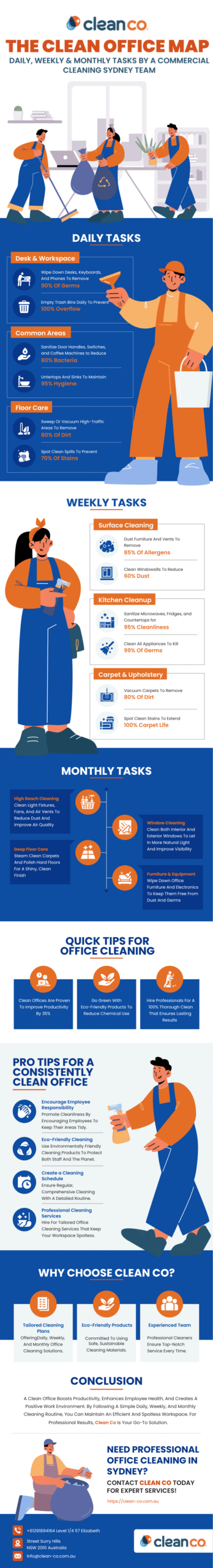 Daily Tasks Desk & Workspace Wipe Down Desks, Keyboards, And Phones To Remove 90% Of Germs Empty Trash Bins Daily To Prevent 100% Overflow Common Areas Sanitize Door Handles, Switches, and Coffee Machines to Reduce 80% Bacteria Tops and Sinks to Maintain 95% Hygiene Floor Care Sweep Or Vacuum High-Traffic Areas To Remove 80% Of… Continue reading The Clean Office Map: Daily, Weekly & Monthly Tasks by a Commercial Cleaning Sydney Team